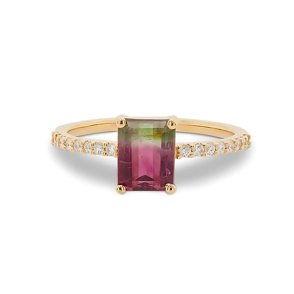 Anel lindíssimo com turmalina melancia. Design que transparece sofisticação e delicadeza com uma boa dose de alegria pela combinação das cores verde e rosa.