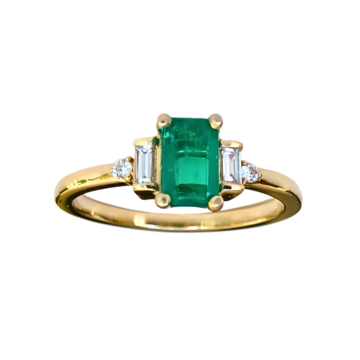 Anel de ouro 18k com esmeralda natural em lapidação retangular, topázio natural em lapidação retangular e diamantes naturais