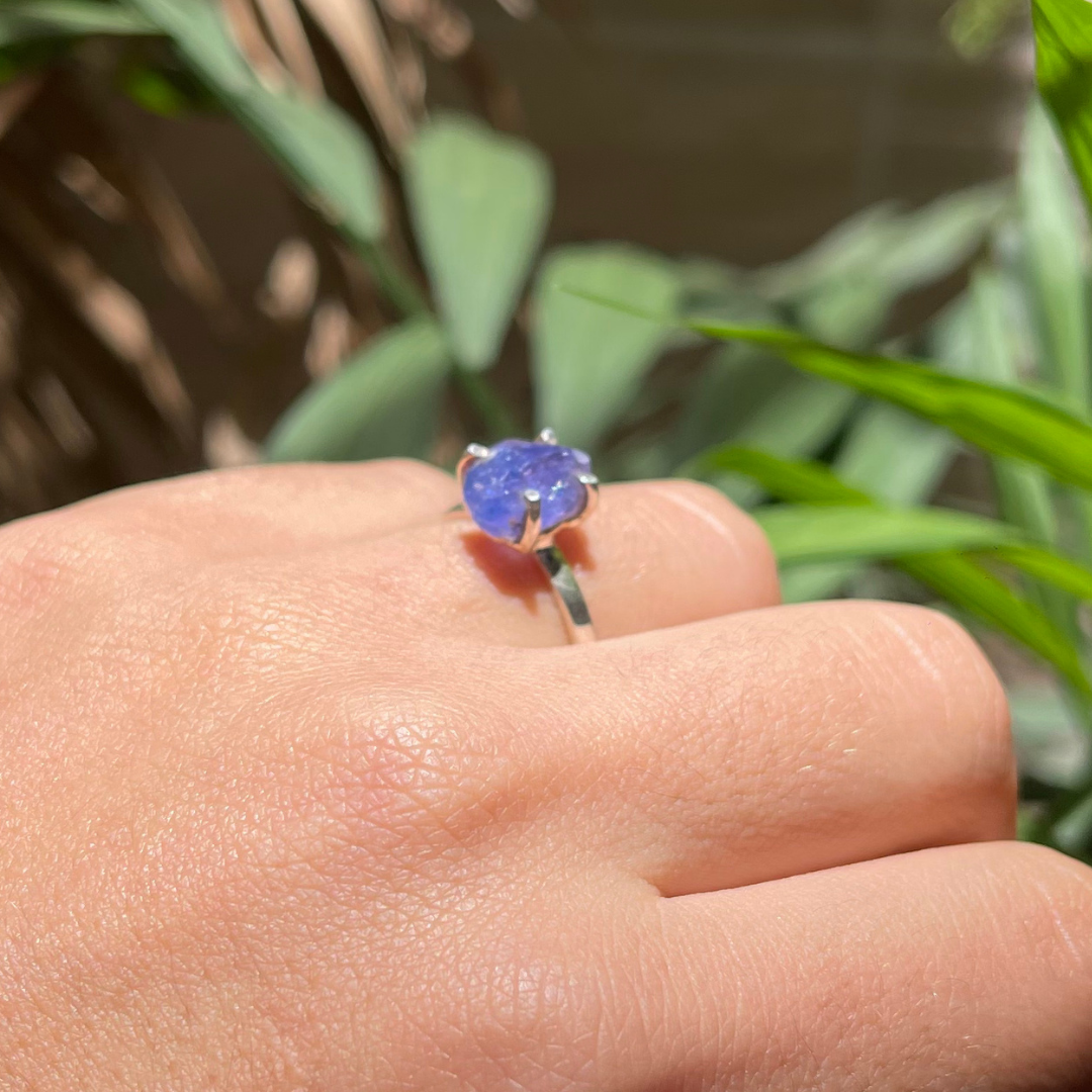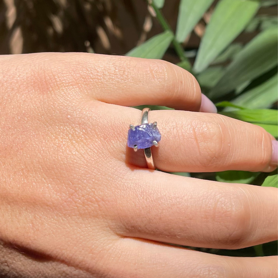 O design delicado e contemporâneo deste anel valoriza a beleza orgânica da tanzanita bruta.