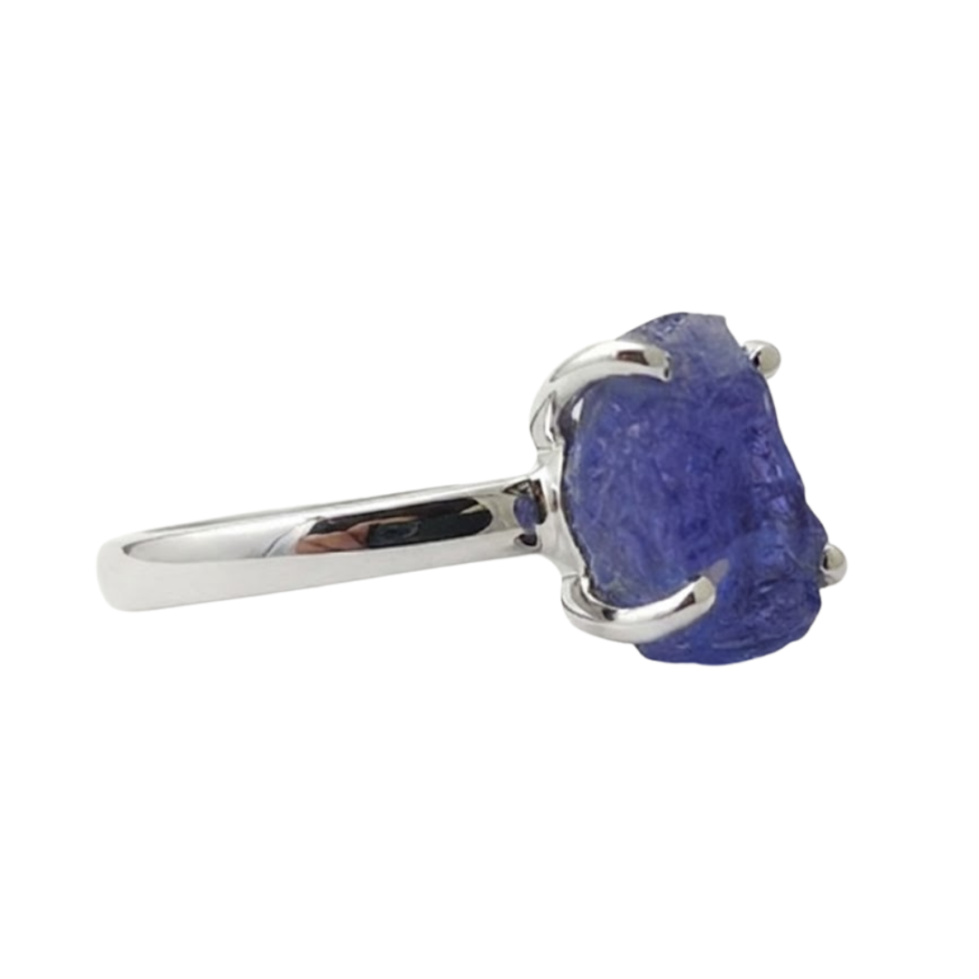 Um anel elegante, raro e extremamente sofisticado, confeccionado em Prata 950 e adornado com uma tanzanita bruta natural de 10 × 8 mm, uma das gemas mais desejadas do mundo.
