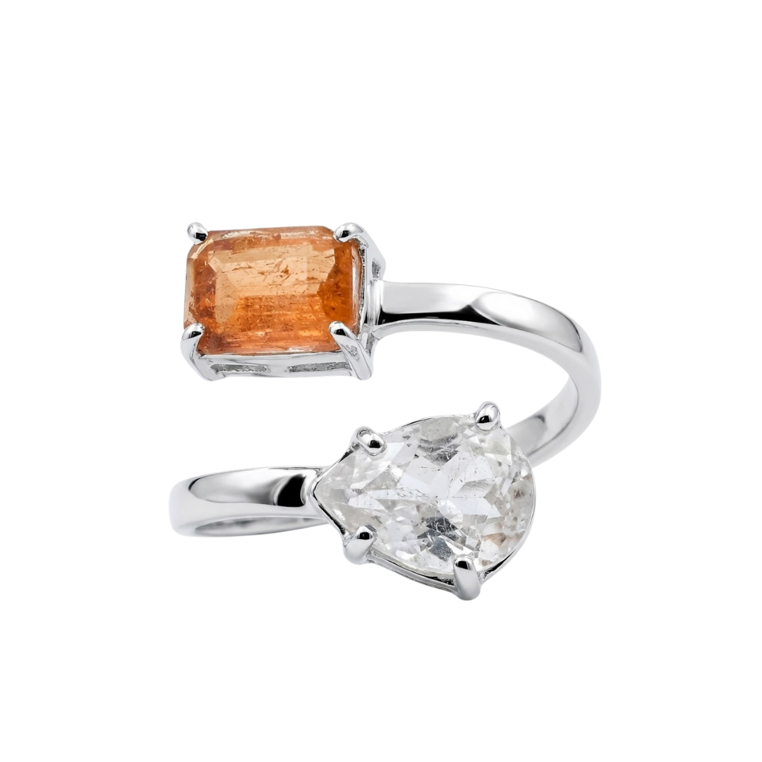 Anel em Prata 950 com Topázio Imperial Rose e Morganita Natural – Modelo Regulável
