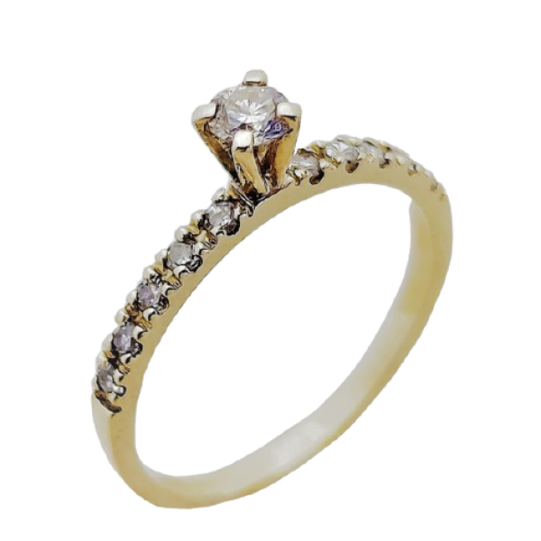 Anel solitário de ouro amarelo 18k com um diamante natural de 10 pontos (0,1 ct) e dez diamantes de 1 ponto cada no aro.