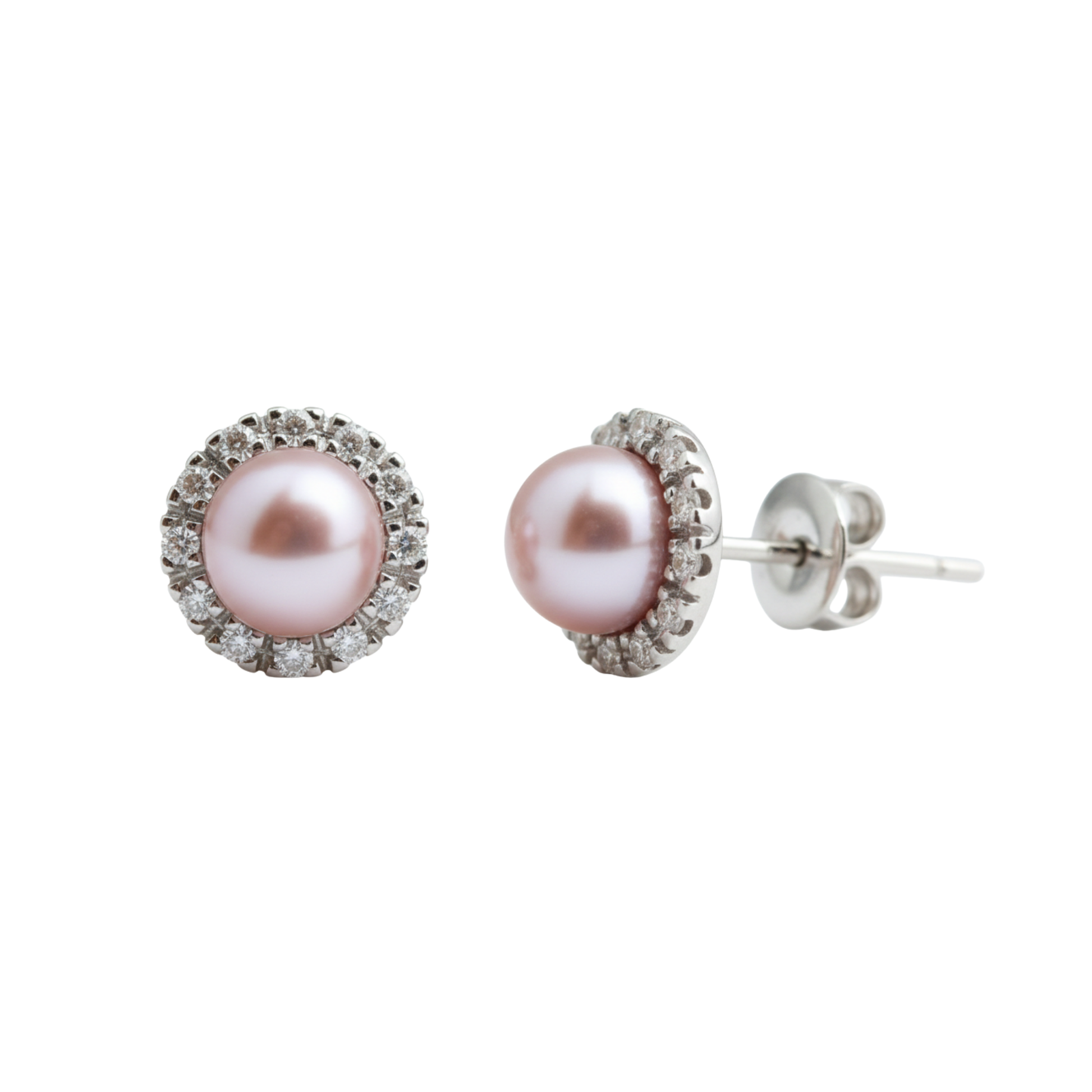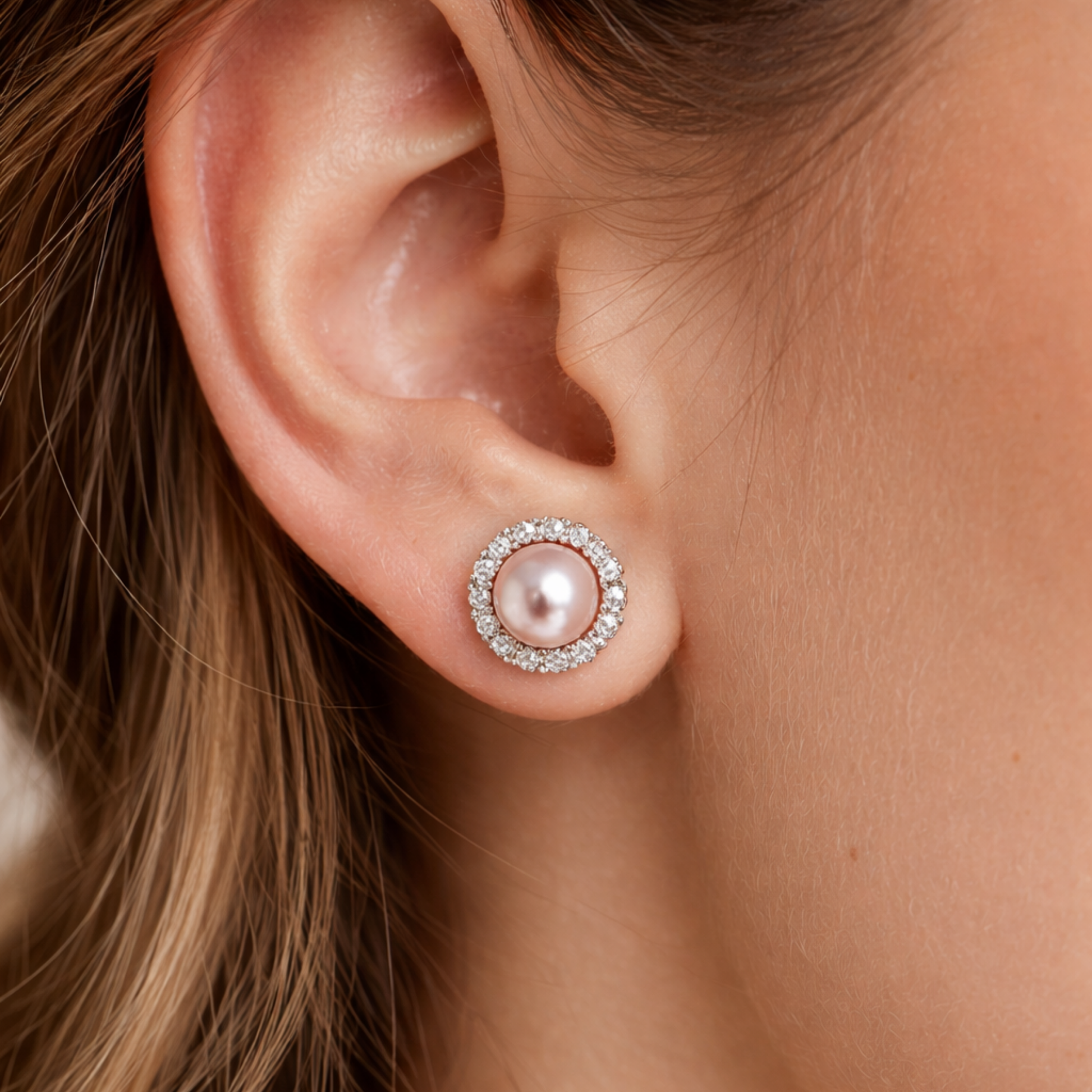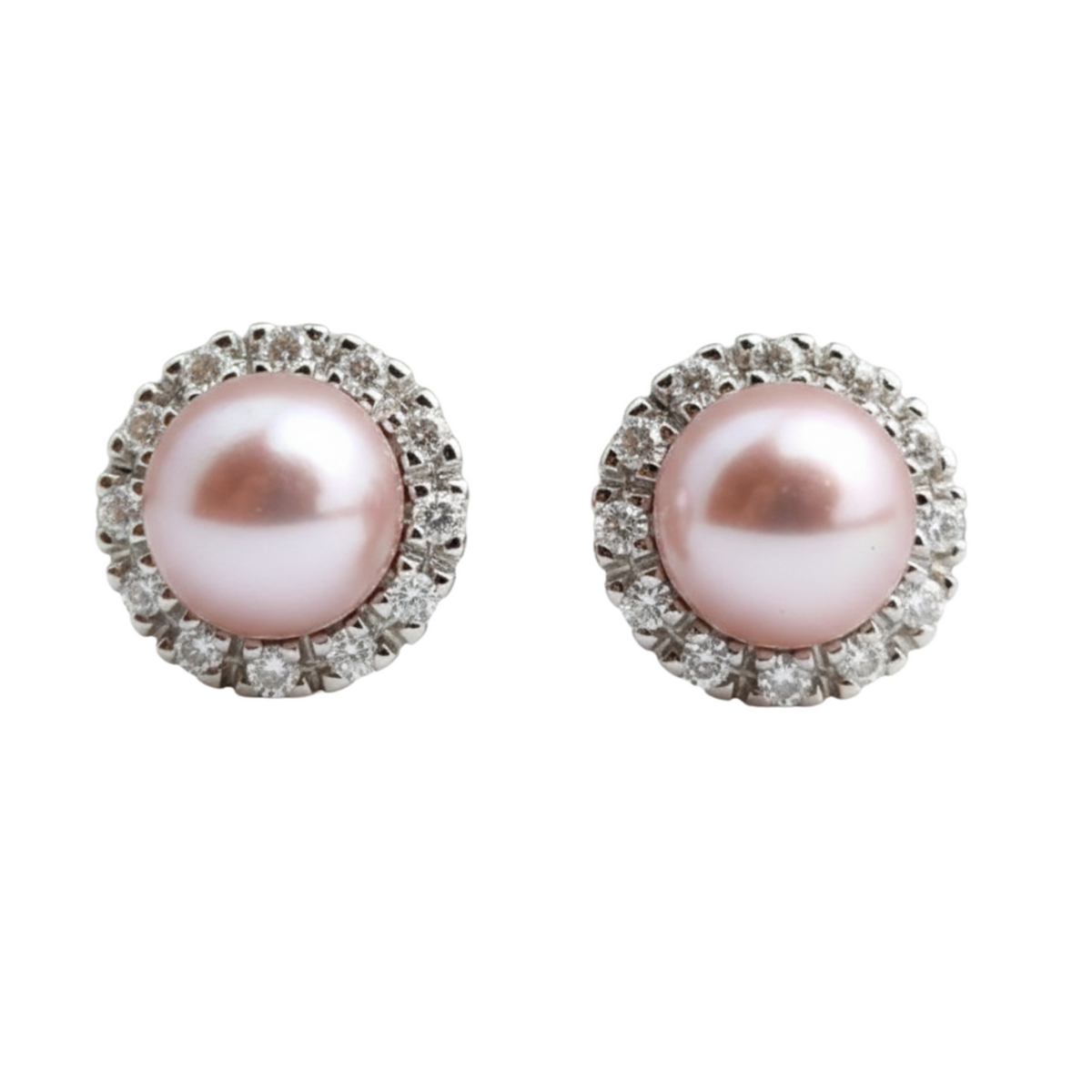 Brincos em Prata 925 com Pérola Natural Rosé e Halo de Zircônias