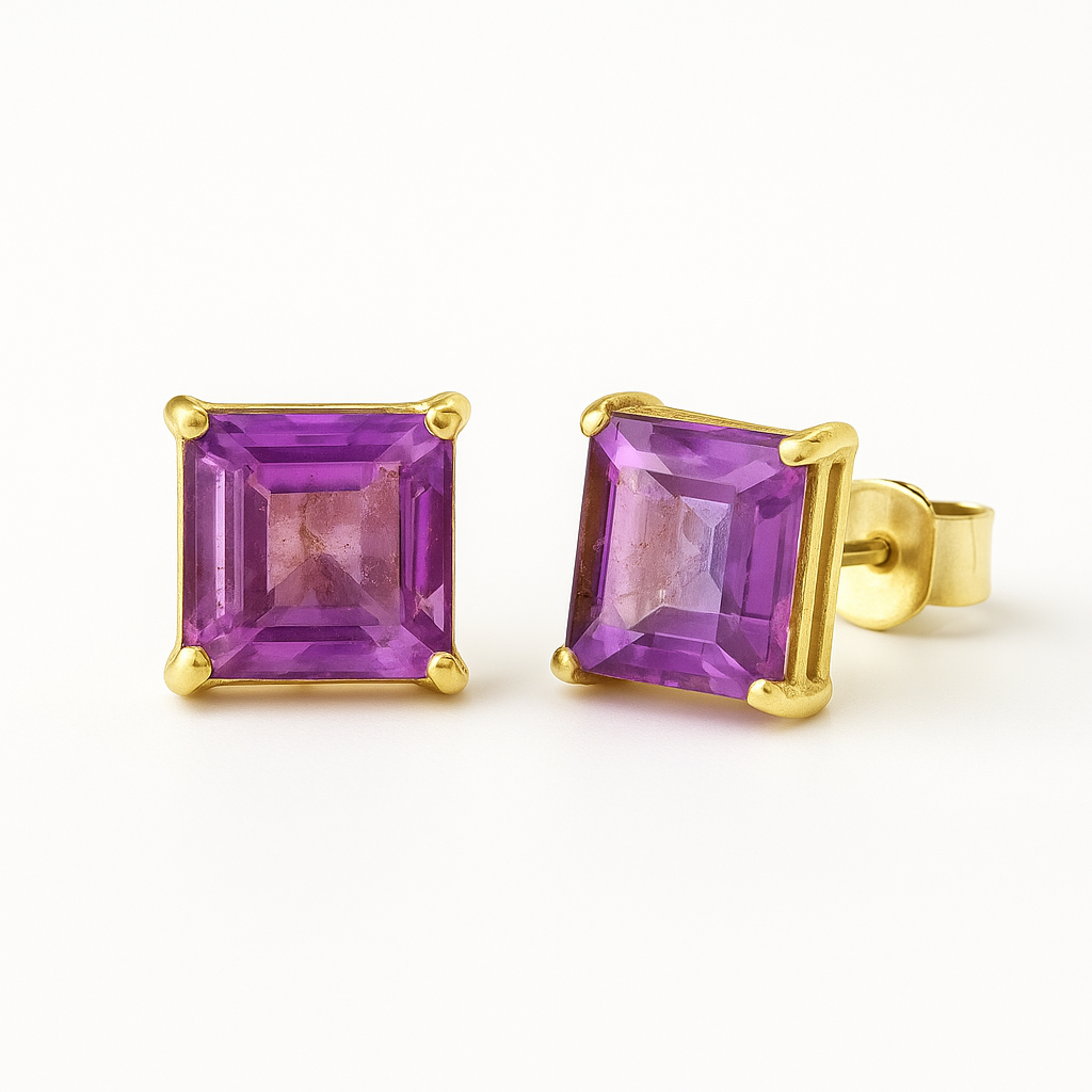 Brinco confeccionado no ouro amarelo 18k, modelo simples, delicados e genuínos com ametistas naturais em lapidação quadrada