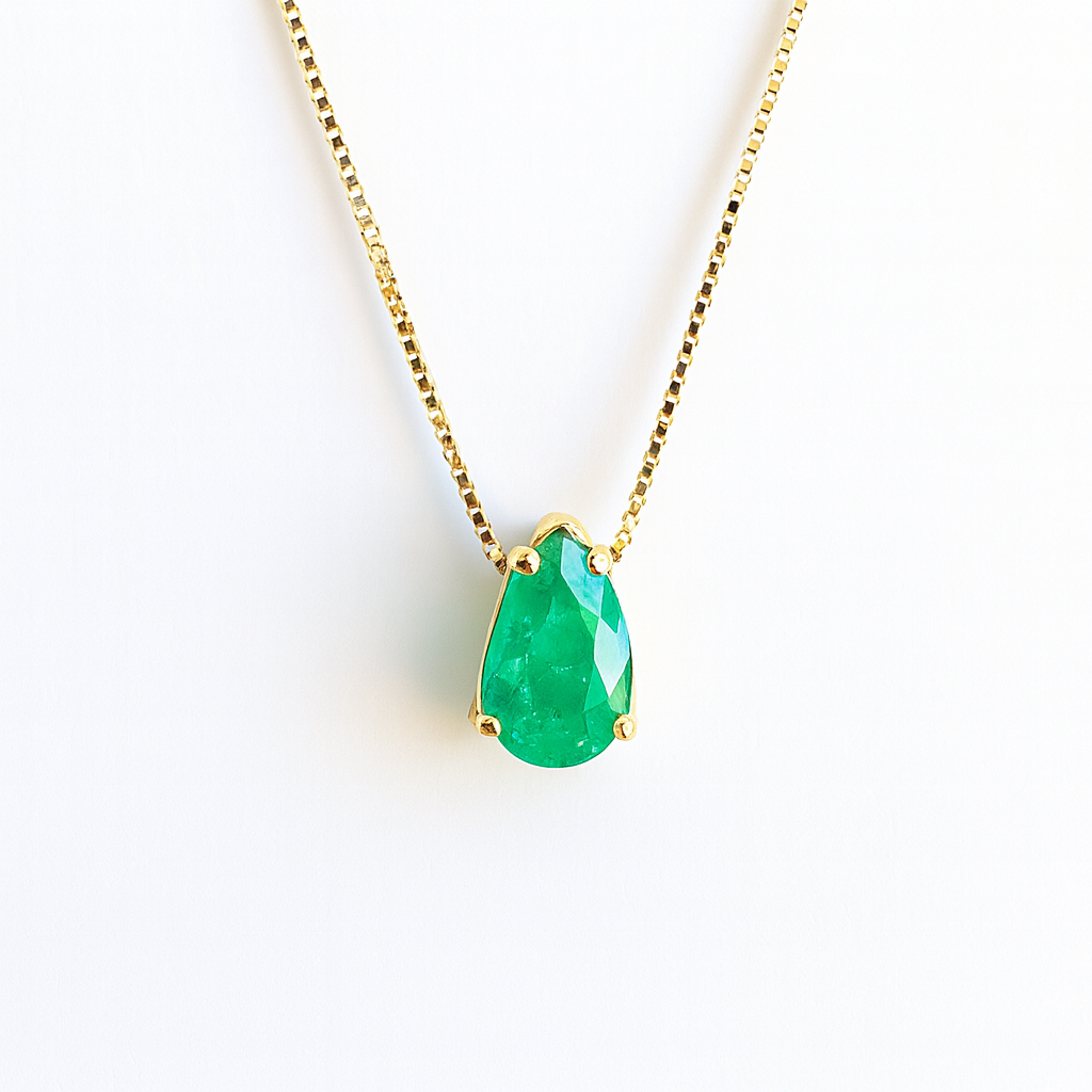 Um lindo e elegante colar confeccionado no ouro amarelo 18k, modelo estilo ponto de luz com esmeralda natural em lapidação gota