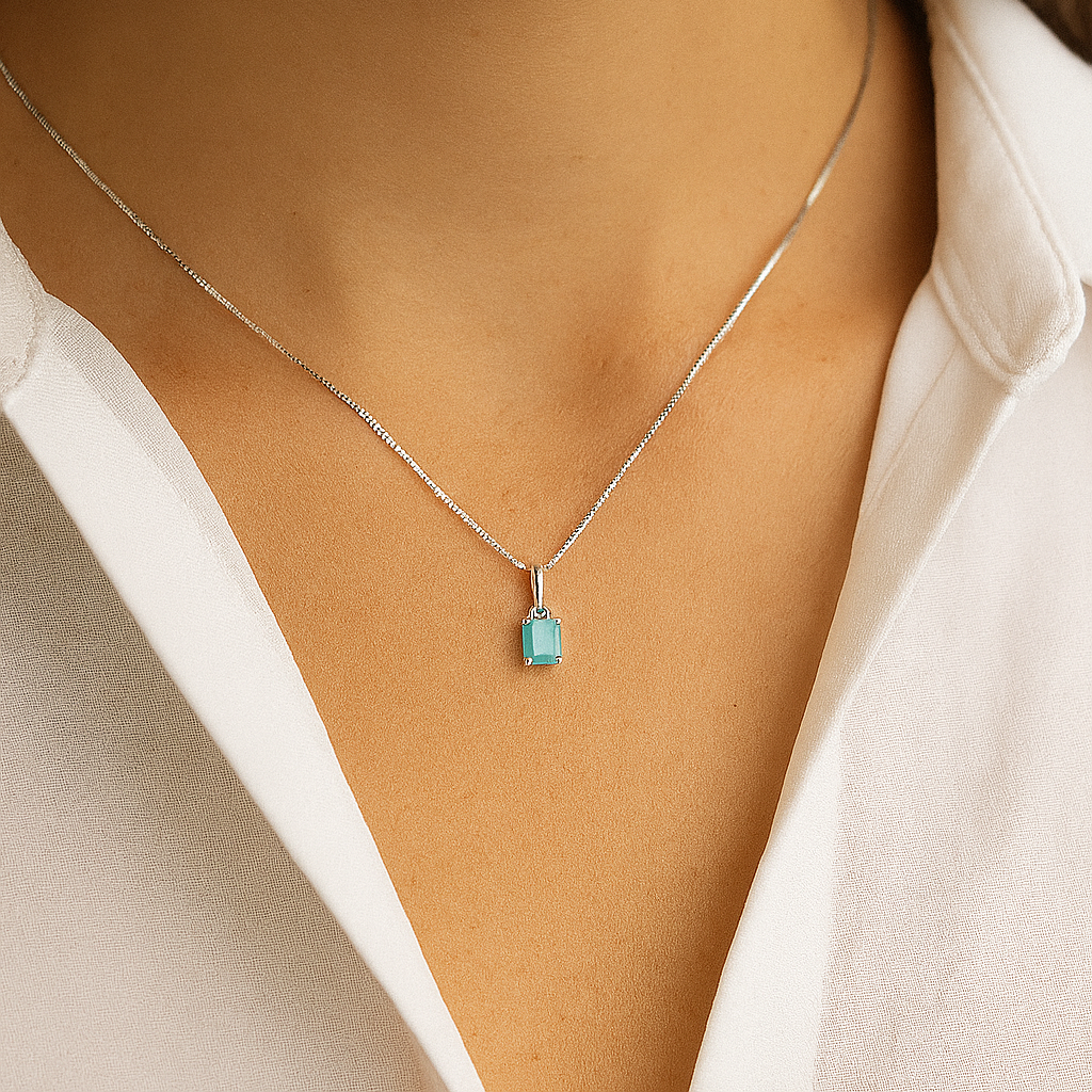 Um lindo e elegante colar confeccionado na prata 950, com esmeralda natural em lapidação retangular.