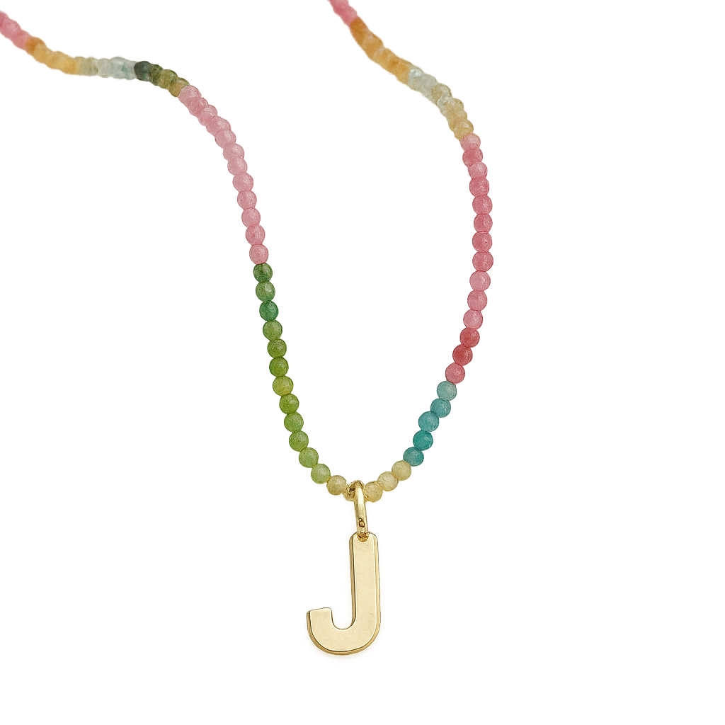 Um lindo e elegante colar confeccionado no ouro amarelo18K (fecho, acabamentos e pingente), com um pingente de ouro amarelo 18K personalizável (inicial de sua escolha), pedras naturais de turmalina melancia e variações de cores de verde, azul e rosa