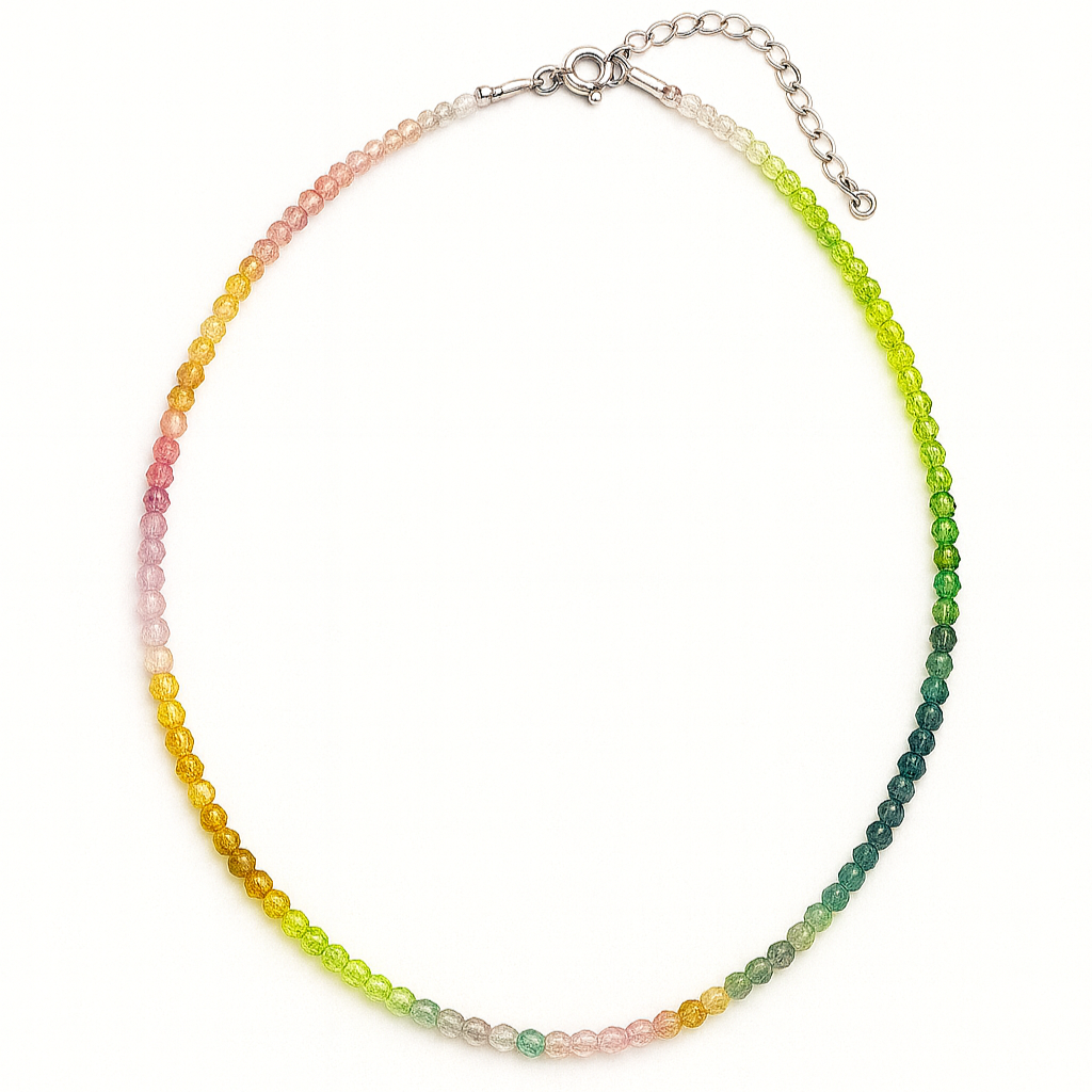 Um lindo e elegante colar confeccionado na prata 950 (fecho e acabamentos), com pedras naturais de turmalina melancia e variações de cores de verde, azul e rosa