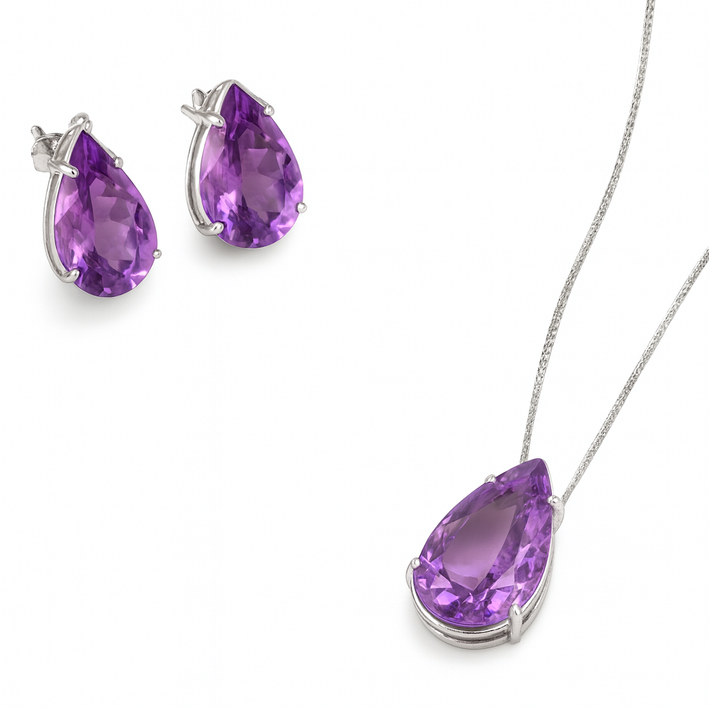 Um lindo e elegante conjunto confeccionado na prata 950, com ametista natural em lapidação gota
