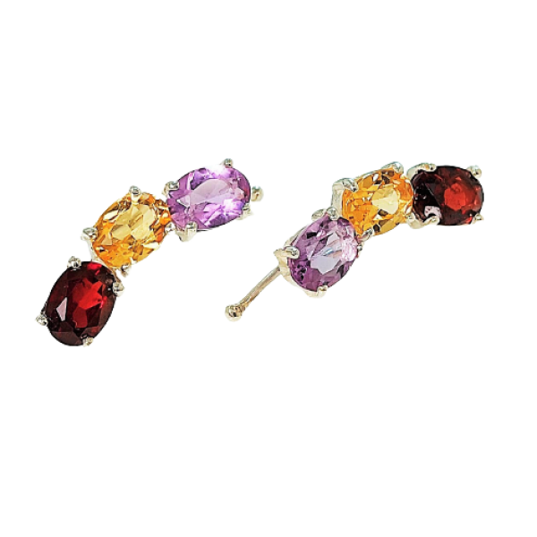 As três pedras naturais do brinco modelo Ear Cuff, encontram-se lapidadas em corte oval, com 6 x 4 mm cada (gema roxa: ametista; amarela: citrino; vermelha: granada). Estão cravadas em prata 950 (grau de pureza = 95%).
