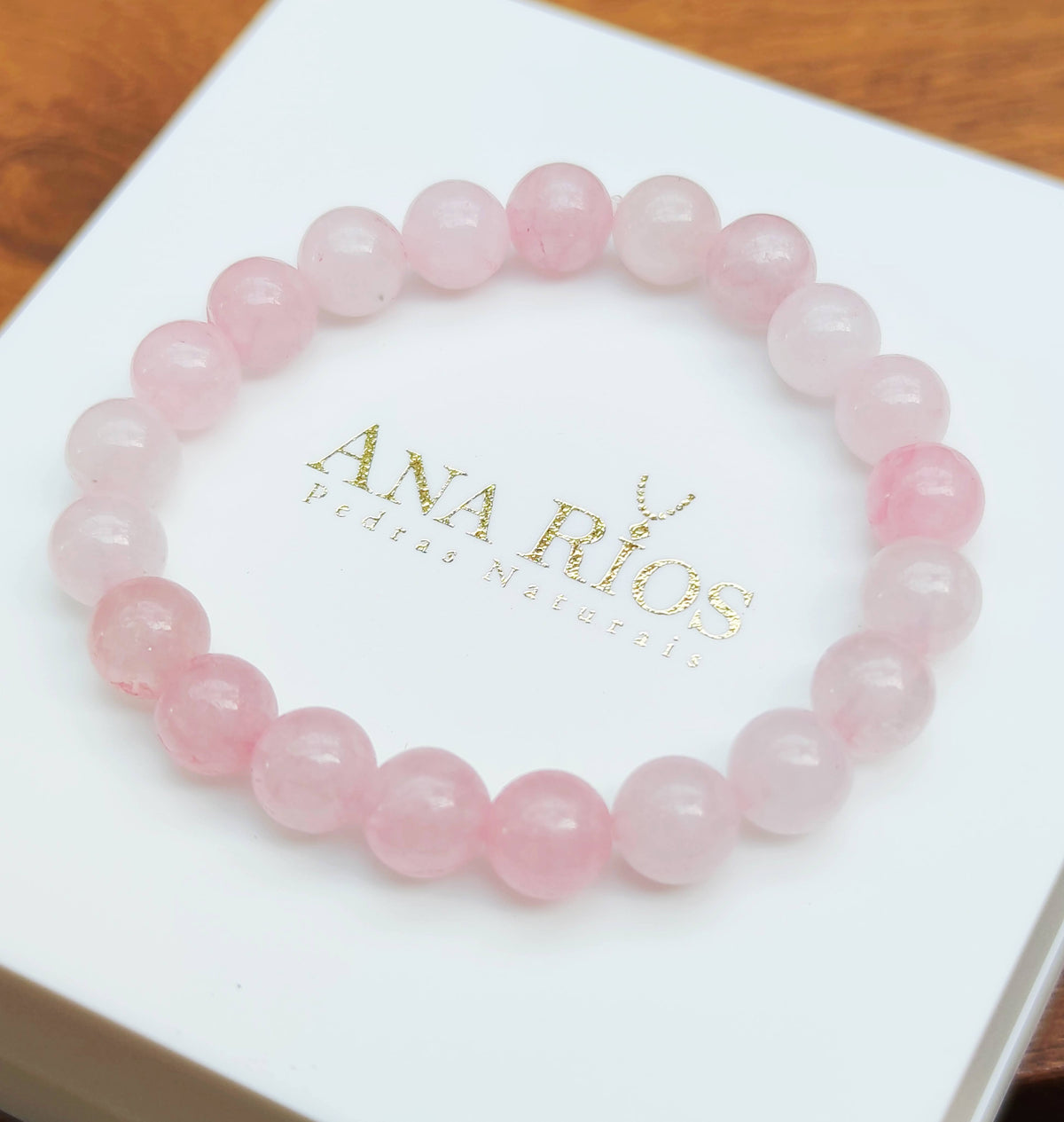 Pulseira confeccionada com fio de silicone e pedras esféricas de quartzo rosa .